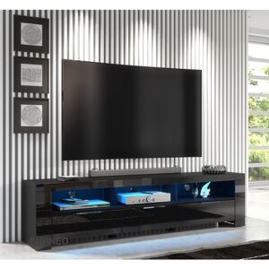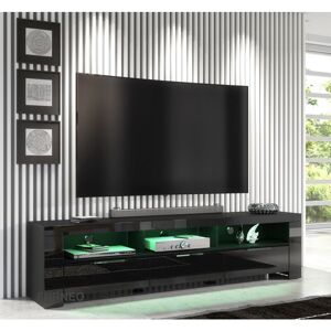 The TV stand features a high gloss black finish to the front of the unit (including doors and front panels) with the rest of the body (top, sides and inside) in a matt black finish. The unit includes three cupboards, all with with a drop down door and an upper open space for your media and other items. It is suitable for TV's up to 75in. White LED lights are included, they are mains powered with a UK power adapter and foot switch to turn them on and off. Picture instructions, and a written notice are included with the item, these should be looked over carefully, before attempting assembly.