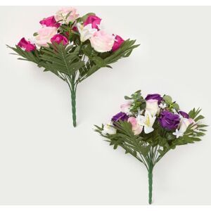Arrangement of artificial flowers featuring realistic rose and lily bouquets from Homescapes' artificial plants and trees collection. These silk flowers have been designed to stand the test of time. Bright, vibrant, and colourful faux flowers; pink and purple roses with white lilies and a variety of greenery leaves, made from silk-like material. Great for artificial bouquet or floral arrangements for home decoration, weddings, anniversaries, plastic flowers crafts, or DIY. These decorative artificial flowers are great keepsakes for any special day. Botanically correct and easy to style, these beautiful flowers will pair perfectly with our diverse range of Homescapes artificial plants and flowers collection. Homescapes Rose & Lily Bouquet, Pink & Purple Set of 2
