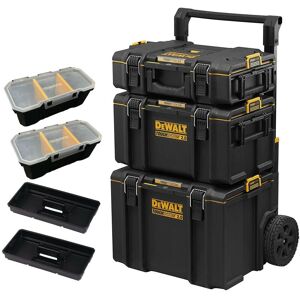 DeWALT DWST83526-1 TOUGHSYSTEM 2.0 5pce Mobile Box Bundle built up using the DWST83293-1 TOUGHSYSTEM DS166, DWST83342-1 TOUGHSYSTEM DS400, DWST83295-1 TOUGHSYSTEM DS450 and 2 x TOUGHSYSTEM 2.0 DWST83408-1 DeWALT DWST83293-1 TOUGHSYSTEM 2.0 DS166 Box comes with the latest Easy Close metal wire front latches providing easy one handed operation and Auto Stacking Latches intuitive easy to use and time saving latches for connecting modules together. The DWST83293-1 DeWALT TOUGHSYSTEM 2.0 DS166 Box uses a high performance seal in the lid ensuring the box is dust and water jet resistant IP65 to withstand severe weather, better ergonomic wider and stronger handles plus half module compatibility allowing half width modules to be connected to the box. Other features include reinforced padlock eye providing superior security, name panel insert allowing boxes to be labelled up for easy identification of the contents, increased depth from 150mm to 165mm plus 2 removable large organiser cups with