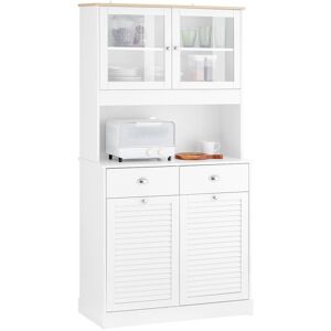 Modern design tall cupboard sideboard is ideal for the kitchen, dining room, living room, etc. This trash bin tall cupboard is designed with a tilt out door for storing your trash bin, will effectively hide the unpleasant smell and prevent your pet knocking over the trash bin. Please note trash bin is not included in the delivery. With 4 closed doors (2 wooden shutter doors and 2 glass doors) and 2 closed drawers, this tall cupboard provides ample storage space for you, as well as effectively prevents dust and protects your privacy while meets your needs to display items. The open storage compartment is ideal for kitchen appliance like microwave oven and coffee machine. It features a round hole on the back panel. It is designed for cable, making charging kitchen appliance easier. Both the shelf behind the glass doors and the shelf behind the wooden shutter door on the right are adjustable in three heights, allowing you to store different sizes of items. Coming with anti-tipping device, ensuring great stability and safety. Multifunctional as well as fashionable: it can be used as a cupboard in the kitchen, sideboard in the dining room, and storage display cabinet in the living room. Space saving storage solution that will help keep your room tidy and organized. Modern and elegant design, so it sure fit perfectly with any style of decor. Product Details Material: MDF, particle board, tempered glass. Dimensions: W92 x D40 x H180cm. Weight: 54.2kg. Load capacity: 86kg. Item comes in 2 flat packs and requires self-assembly. Detailed instructions supplied. The decorative elements are not included in the delivery. Please contact us by email uk@sobuy-shop.com when you have any question, we will reply as soon as possible!