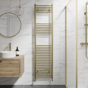 GENERAL DESCRIPTION The DuraTherm heated towel rail features a stunning flat panel design and a stylish brushed brass finish. It is perfect for drying and warming towels, enhancing the attractiveness of your bathroom. This towel rail connects to the central heating system, similar to a standard radiator, providing warmth and comfort in your bathroom. TECHNICAL SPECIFICATIONS Panel Profile: Flat Height: 1800mm Width: 600mm Colour: Brass Material: Steel Fuel Type: Central Heating Depth: 85mm Panel Configuration: Single Tube Centre: 550mm No. of rails: 32 Maximum Water Temperature: 95°C Weight: 12.60KG BTU (DeltaT30): 2001 BTU (DeltaT50): 2795 BTU (DeltaT65): 306 Watts (DeltaT30): 586W Watts (DeltaT50): 586W Watts (DeltaT65): 819W Projection from back: 44-54mm Projection from front: 74-84mm No. of connections: 4 Minimum Water Temperature: 40°C Heat Output: 2795BTU OTHER INFORMATION 10-year guarantee against manufacturing defects Radiator valves are required but not included