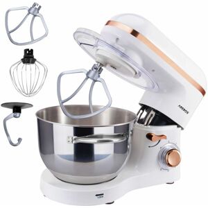 【 Powerful 1500W motor with 6 speed settings 】The 1500W high-performance motor is made of pure copper and a sturdy ABS housing. 6 speed settings and a built-in overheat protection feature ensure quick and safe operation of the kitchen machine. 【 6 l bowl of large capacity and with 2 handles 】 This large 6 l bowl is made of food-grade stainless steel; it will meet all your requirements and is dishwasher safe. The included splash guard allows for clean working and is easy to clean. 【 Planetary stirring technology for perfect kneading & stirring results 】Due to the planetary stirring system, a mechanism that makes the stirring tool move beyond the circular center, all areas inside the mixing bowl will be reached uniformly. 【 Quick and convenient anti-slip design 】 The AREBOS food mixer includes several accessories: whisk, dough hook, and beater. The built-in blue LED light indicates the 6 different speed settings, such as for whisking eggs, kneading dough and many more functions. 5