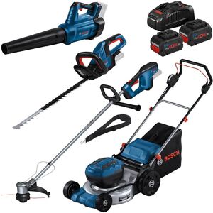 The Bosch Professional 4 Piece 18v Cordless Brushless Garden Set contains a GFR 18V-23 Brush Cutter, GRA 18V2-46 Lawnmower, GHE 18V-60 Hedge Trimmer and GBL 18V-750 Leaf Blower. GFR 18V-23 Features and Benefits • Brushless motor • Electronic speed control • Lightweight, ergonomic design and low noise level GFR 18V-23 Specifications • Cutting System: 3 Tooth Blade, Pro Tap • Cutting Diameter (Line): 330mm • Line Diameter: 2.4mm • Cutting Diameter (Blade): 230mm • Blade Thickness: 2mm • Blade Bore: 25.4mm • Speed Output No Load: 4,500-6,400rpm GRA 18V2-46 Features and Benefits • BITURBO brushless motor runs on two 18v batteries • Full metal deck • Easy 2-step height adjustment and space-saving vertical storage GRA 18V2-46 Specifications • Cutting Width: 460mm • Cutting Height Range: 30-70mm • Collection Box Capacity: 60 litre • Wheel Diameter (F/R): 170/240mm GHE 18V-60 Features and Benefits • Brushless motor • Bosch Anti-Blocking System • Low weight, ergonomic design and optimal balance GHE 18V-60 Specifications • Blade Length: 600mm • Tooth Opening: 23mm • Cutting Speed: 1,500rpm • Stroke Rate: 3,000spm GBL 18V-750 Features and Benefits • BITURBO brushless motor and axial fan • Variable speed control • Lightweight, ergonomic design GBL 18V-750 Specifications • Max Airflow: 780m³/h • Max Air Speed: 198km/h Contents • GFR 18V-23 18v Brushless Brush Cutter • GRA 18V2-46 BITURBO Twin 18v Brushless Lawnmower • GHE 18V-60 18v Brushless Hedge Trimmer • GBL 18V-750 BITURBO 18v Brushless Leaf Blower • No Batteries • No Charger