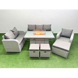 Important: Please put the gas fire pit on the glass top not under the glass .Do not cover the igniter with lava .please refer to the picture in the listing. we strongly recommend using 5 kg gas tank. Before using the fire pit ,please check it carefully if there is any leakage at the joint place or the hose . if the gas bottle is not fixed correctly or the hose has some leakage it may cause danger . Pls kindly leave your mobile number at checkout for not delaying your shipment . Set dimensions: • 1 x Reclining chairs Size: 74W x 69D x 79H cm • 1 x Love Sofa Size: 124W x 67D x 79H cm • 1 x 3 Seater Sofa Size: 177W x 67D x 79H cm •1 x Big footstool :65L x 65W x 34H cm • 2 x Fully Assembled Stools :40W x 40D x 34H cm • 1 x Firepit Dining Table Size: 140L x 80W x 69H cm • Sofa Weight Capacity: 250kg • Table Weight Capacity: 80kg Light grey rattan with dark grey fabric .Color may vary due to light or monitor .we are unable to return the item due to this problem .Please contact us before