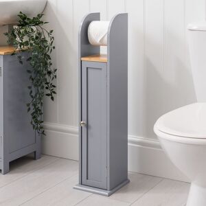 This Grey Toilet Roll Holder Cabinet is a toilet roll holder and storage cabinet rolled into one. It features a reel at the top to easily tear off a sheet of paper and slimline cabinet to store up to four spare rolls. Plus, a grey finish and bamboo top for a beautiful, natural look. Slimline Design The cabinet is 70cm tall, 18cm wide, and 20cm deep for spaces big or small. Its slimline shape makes it perfect for displaying beside a toilet without taking up valuable space. Cabinet with Shelf The cabinet is made from durable MDF with a silver-coloured handle on the door and metal hinges to easily open. It contains two levels of storage to store up to four toilet rolls. Easy to Assemble The cabinet is delivered flat-packed with minimal parts, full fixings, and clear instructions for easy assembly. No tools are required other than a Phillips screwdriver. Specifications Durable MDF construction Smooth, grey-painted finish Beautiful natural bamboo top Telescopic reel for a toilet roll