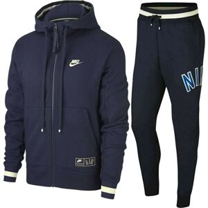 The Nike Air Men's Zip-Through Tracksuit Set in navy features a drawstring hood, zip closure, and embroidered Swoosh logo. It includes printed branding, a split kangaroo pouch pocket, woven brand patch, and ribbed cuffs and hem for a snug fit. The joggers have an elasticated waistband with an adjustable drawstring and ribbed cuffs at the ankles for added comfort and a streamlined look.