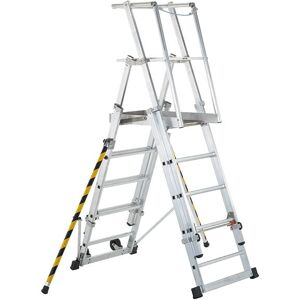 Number of Rungs: 5-9. Platform heights: 1.30 / 1.60 / 1.80 / 2.10 / 2.40m. Height including railing (max.): 3.38m. Footprint, stabiliser extended, L x W: 2.30 x 2.55m. Footprint, stabiliser retracted, L x W: 2.30 x 0.81m. Dimensions folded: 2.72 x 0.81 x 0.39m. Weight: 38.5kg. Delivered Direct to Business, Site or Home, please note: a carriage surcharge may apply dependent upon the delivery address, contact us for further details. The Zarges ZAP Access Platform is a telescopic platform for working at a height of up to 4.30m, which is developed according to the latest EU Directives for working at heights. The platform has a large standing surface (665mm x 440mm) with guard rail and knee bar to ensure maximum work safety and comfortable standing. It has simple height adjustment according to the push-up ladder principle, thus different heights can be obtained with only one work platform. The platform complies with EN 131, even without stabilisers thanks to crosspieces on both sides. The