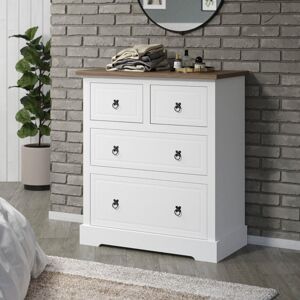 The Claar Chest of 4 Drawers is a practical yet stylish storage solution that suits both bedrooms and living areas beautifully. Featuring two compact drawers at the top and two generously sized drawers below, it provides versatile storage for clothing, accessories, or household essentials, helping you keep your space neatly organised. Crafted from a combination of sturdy MDF and a solid 25mm waxed pine wood top, it showcases durability while adding a charming natural contrast to the crisp white finish. Decorative black metal handles and rustic accents give this piece a Mexican-inspired flair, blending timeless elegance with warm, homely character. Designed not only for function but also for charm, the Claar chest effortlessly complements a wide range of interior styles, from coastal-inspired themes to farmhouse and contemporary interiors. The white finish brings a fresh, airy look, while the pine top highlights the natural wood grain for added depth and authenticity. A UV lacquer finish adds protection against wear while making the surfaces easy to clean, ideal for everyday use in busy homes. Equally suited as a bedroom chest of drawers or as a storage unit in a living or hallway setting, the Claar chest offers lasting design with practical storage that never compromises on style. Lark Manor