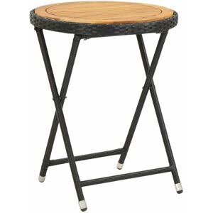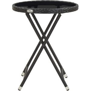 Enjoy a wonderful tea time with this rustic tea table. It makes a truly user-friendly and eye-catching addition to your garden and patio. Featuring a powder-coated steel frame covered with weather resistant PE rattan with UV protection, this table ensures years of outdoor use. Made of solid acacia wood in strong support, the tabletop is durable and sturdy. When not in use, the outdoor table can be easily folded away to save space. Note: In order to extend the life of your outdoor furniture, we recommend you to clean it regularly and do not leave it outdoors without protection unnecessarily. Clean: Use a mild soap solution Storing: If possible, store in a cool, dry place indoors. If the product is stored outdoors, protect it with a waterproof cover. Wipe and dry the excess water or snow from flat surfaces after a rain or snowfall. Allow sufficient air circulation to avoid moisture-related damage. Colour: Black Material: PE rattan, steel, solid acacia wood Dimensions: 60 x 75 cm