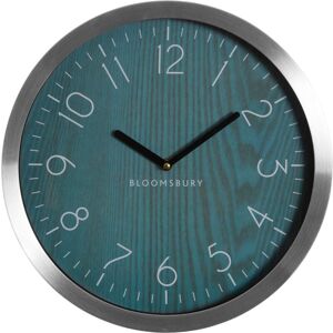 Its thick case is made from reflective aluminium and has a brushed finish. A pair of minimal black hands complement the grey toned face, with white vintage style numbering that contributes to the clock's modern retro design. White Bloomsbury lettering is positioned beneath the hands, while a pane of clear glass covers the face.