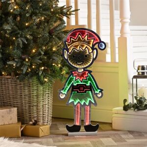 Transform your holiday decor with this stunning standing Elf infinity led light decoration. Infinity lights are a modern mirror effect using light to create an illusion of depth and a repeating light pattern. This simple yet mesmerising light up display is thin whilst creating this amazing 3D effect as you view of the elf from different angles. Create a festive display and a talking point for all your family and guests. Suitable to be placed on most flat surfaces such as a mantle piece, windowsill or by the front door to welcome visitors this year. Featuring an infinity mirror with Multi-Coloured LEDs, this creates the never ending reflection of the elf when lit up. The decoration sits on a wooden base and is mains operated with a generous 3m clear cable from product to plug. Quick and easy to set up, just simply peel the film off the mirror then attach the base and plug in. Suitable for indoor use only. Product Dimensions Height: 74cm Length: 32cm Stand: 20 x 7cm Cable Length 3m