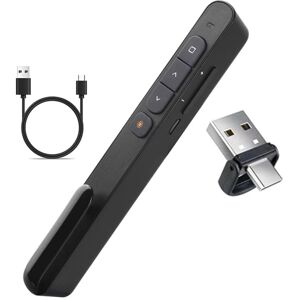 [Dual USB Connection]Equipped with USB-A and USB-C ports, the presentation remote connects seamlessly to a wide range of devices, including most laptops and PCs, ensuring wide compatibility and ease of use in a variety of environments. [Comprehensive Control Functions]This versatile wireless presenter has multiple functions, such as page navigation, volume adjustment, window switching, and hyperlink support, to make presentations easy, all plug-and-play. [Red Light Enhanced Visibility]Designed for clear presentations, the remote control is equipped with a vivid red light, perfect for highlighting key points, with an effective range of up to 200 meters. Its remote control range extends to 30 meters, ideal for large venues (not suitable for LED/LCD screens). [Portable and Convenient Design]The portability of the presenter is essential. The USB receiver tucks neatly into the remote housing to prevent loss. It is designed for portability and features a pen clip design that fits easily