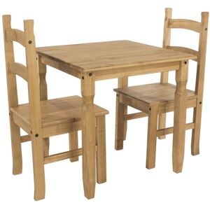 Corona square dining table & 2 chair set, It is made from solid wood which means you will see some variances in the shading, woodgrain and knots, which is part of the natural characteristics of the pine. It has an antique wax effect finish and the legs are secured with black finish metal bolts for strength and stability, the table top has an attractive border detailing and the chairs have solid wooden seats. Size = (W) 75cm (D) 75cm (H) 75cm