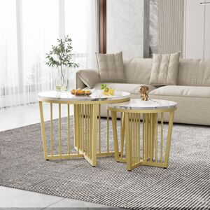 Product Features High gloss marble look: The high gloss marble look table tops add a luxurious and elegant atmosphere to any room and are also easy to clean. Unique golden iron legs: The golden iron legs not only offer a stylish and noble appearance, but also excellent stability and durability. Flexible nesting design: The two tables can be nested or used separately, giving you more flexibility and optimal use of space. Versatile use: Whether in the living room as a coffee table, as a side table next to the sofa or as a tea table on the balcony - this nesting coffee table set fits perfectly into any environment and offers practical use and comfort. Sturdy iron legs: The high-quality iron legs ensure the stability and durability of the tables and guarantee a long service life.Description Long description Our stylish high gloss marble looks nesting coffee table set combines elegance and functionality and is ideal for any home. The set consists of a large table (70x70x50cm) and a smaller