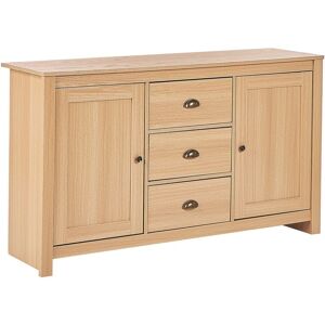 Traditional Style 3 Drawer Chest. Beautiful sideboard in a timeless design that is sure to complement any home décor with its simple lines and warm tone of a wooden finish. Featuring two closed cabinets and three drawers, with lovely metal handles, it provides ample storage space. Thanks to its classic look, it will make a perfect addition to any living room or bedroom. Details: Product Type: Sideboard Style: Retro General Color: Brown Material Type: Wood Main Material: Particle Board Additional Material: Metal Legs material: Engineered Wood Shelves number: 4 Doors Opening: Standard Drawers: Yes Finish: Melamine Key Locked: No Number of Doors: 2 Number of Drawers: 3 Shelves: Yes Dimensions: Depth: 40 cm Width: 140 cm Height: 80 cm Weight: 50 kg Drawer Weight Capacity: 5 kg Top Weight Capacity: 30 kg Offer Includes: 1 x Sideboard Key Features: Perfect for Both a Bedroom and a Living Room, Classic Design, Wood-like Finish for Natural Look, Solid Workmanship, Ideal for Home and Office