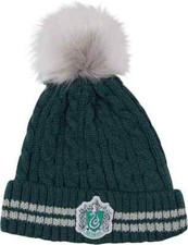Fabric: Cable Knit. Design: Embroidered, Logo, Ribbed, Slytherin, Text. Branded Label, Faux Fur Pom Pom, Turned Up Cuff. 100% Officially Licensed. Harry Potter Men's Slytherin Pom Pom Beanie in Green
