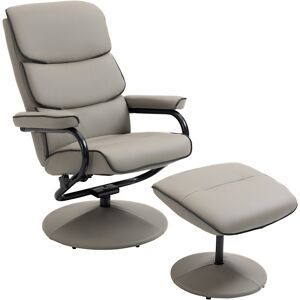 Feature: Manually pushes back to a 145° reclined angle for you to relax comfortably 360° swivel reclining armchair allows easy rotate in all directions Solid wood base for a suave look, with lots of support Thick, all-over padding and padded armrests for comfort Assembly required Specification: Colour: Light Grey Material: Steel Frame, Wooden Legs, PU, Foam Sofa Dimension: (upright) 80W x 79D x 100H cm, (extended) 80W x 122D x 85H cm Footrest Dimension: 48W x 42D x 42.5H cm Seat Size: 52D x 50W cm Backrest Dimension: 66W x 68H x 15D cm Max. Tilt Angle: 145° Weight Capacity: (sofa)160kg, (footrest)20kg Flat Pack: Yes Item Label: 833-698V70LG 1 x Recliner 1 x Footstool 1 x Manual
