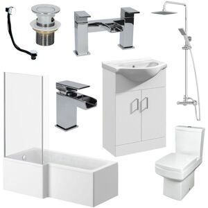 Key Features: Modern White bath, vanity unit, toilet and toilet seat Stylish shower, taps, and waste Dual head bar shower - large 200mm overhead shower and adjustable head Contemporary L-shaped shower bath - 1400mm Dual flush, close-coupled toilet with soft-close toilet seat Stunning vanity unit with soft close doors 25-year guarantee What’s Included: Affine Royan Space Saving Square Toilet & Soft Close Seat Ceramica L Shaped Shower Bath 1700mm & MDF Side Panel - Left Hand Frameless Shower Screen White Gloss Bathroom Vanity Unit - 560mm Architeckt Thermostatic Dual Round Bar Mixer Shower Architeckt Dakota Waterfall Basin Mixer Tap Architeckt Dakota Waterfall Bath Mixer Tap Essentials Basin and Pop-Up Bath Waste Pack The Affine Royan Bathroom Suite with a L Shape Shower Bath 1700mm & Vanity Unit includes a bath, toilet, and vanity unit, plus a thermostatic shower, shower screen, taps, and waste. We pride ourselves on our ability to mix the finest bathroom products with stylish and