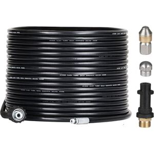 【High Pressure Drain Cleaning Hose】Maximum working pressure: 180 bar, maximum working temperature: 60°C, M22 IT inlet (internal thread) - 1/8" AG outlet (external thread). Package list: 1 x 15m drain cleaning tube; 1 x Karcher M22 adapter, 1 x nozzle, 1 x swivel nozzle, 1 x PTFE tape 【HIGH QUALITY】The flush hose has an inner tube, a reinforcement and a cover. The inner tube is made of thermoplastic polyester. The reinforcement layer is made of a chemically bonded high-strength polyester mesh. The top layer is made of thermoplastic polyurethane for resistance to weather, oil, abrasion and ozone 【2 Drain Nozzles】 One is a nozzle with 3 rear nozzles at 33 degrees, which can easily slide into the drain and sewer hoses to clean and flush debris. The other is a swivel nozzle with 1 front nozzle at 0 degrees to clear clogs and 3 rear nozzles at 33 degrees to clear debris from the front nozzles. 【Compatible Models】The thread size of the pressure washer drain hose end connector is M22 x 1.5