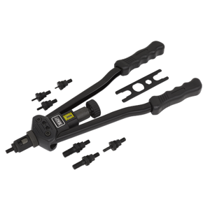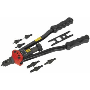- Precision made, high grade alloy steel jaws with strong aluminium body. - Forged alloy steel pins and bolts with double handle bearings for long-life and durability. - Suitable for aluminium, steel and stainless steel rivets. - Includes Chrome Molybdenum special profile nozzles for structural rivets up to 6.4mm(1/4).