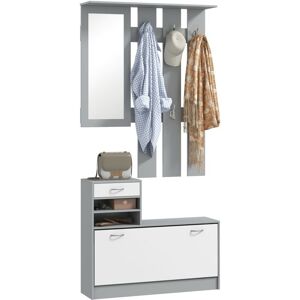 Keeping coats, bags, shoes, accessories and outerwear has never been so efficiently stylish. Crafted from particle board in a versatile grey and white finish, this HOMCOM 3-in-1 hallway organiser will keep your living space clutter-free. Alongside the six coat hooks, it features a pull-down shoe cabinet, a top drawer, a shelf for displaying ornaments and a handy mirror. You'll never misplace anything again! HOMCOM Hallway Furniture Set with Shoe Cabinet, Coat Rack & Mirror, Grey in Dark Grey