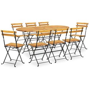 This stylish wooden outdoor dining set creates additional seating space, and also adds a touch of rustic charm to your garden, terrace, or patio! This garden dining set is made of solid acacia wood, a tropical hardwood, which is weather-resistant and highly durable. The sturdy steel also gives additional stability. The table and chairs are easy to clean with a damp cloth and can be folded to save space when not in use. Note: In order to extend the life of your outdoor furniture, we recommend you to clean it regularly and do not leave it outdoors without protection unnecessarily. Clean: Use a mild soap solution Storing: If possible, store in a cool, dry place indoors. If the product is stored outdoors, protect it with a waterproof cover. Wipe and dry the excess water or snow from flat surfaces after a rain or snowfall. Allow sufficient air circulation to avoid moisture-related damage. Material: Solid acacia wood with an oil finish, powder-coated steel Dimensions of table: 160 x 85 x 74