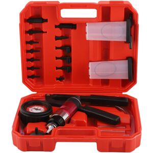 Application: Universal hand-held vacuum pump is suitable for most common vehicles and motorcycle brake bleeding. Specification: Type: Vacuum Pump Tester Material: Plastic, Metal Precise Pressure Gauge: 45psi (3.1 bar) Negative Pressure: Up to 20inHg Condition: 100% Brand New Manufacture Warranty: 2 Years Features: * Fluid Reservoir- Two 120ml fluid reservoirs, one has hose connector cap and one has sealed cap, o rings ensure tightness. * Vacuum Hoses- Transparent hoses help to observe the progress of pulling waste fluid. *14pcs Adapters- Different adapters fit for almost all vehicles. Package Includes: 1x Handheld Vacuum and Pressure Pump Tester 2x Fluid Reservoirs with Cap 2x Long Vacuum Hose 3x Short Vacuum Hose 14x Vacuum Adapters 1x Carrying Case