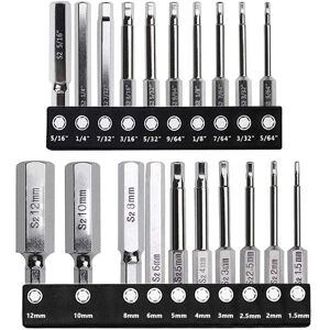 Total Quantity of Screwdriver Bit: 20pcs; Head Type: Hex; Hex Shank Diameter: 6.35mm (1/4"); Length: 60mm (2.36") SAE (Imperial) Size: 5/64, 3/32, 7/64, 1/8, 9/64, 5/32, 3/16, 7/32, 1/4, 5/16 inch; Metric Size: 1.5, 2, 2.5, 3, 4, 5, 6, 8, 10, 12mm High quality s2 steel hex screwdriver bits, high temperature quenching treatment, wear-resistant and impact-resistant, durable and suitable for industrial use. Strong magnetic, high precision, good workmanship, each edge of the screwdriver bit head can lock the screw precisely without damaging the screw and screwdriver head You can use the screwdriver bit on hand tools and easily insert it into 1/4" hex shank power tools (e.g. electric screwdrivers, hand screwdrivers, pneumatic drills, etc.) Specifications Material: s2 alloy steel Head type: hex Shank type: hex Shank Diameter: 6.35mm (1/4 inch) Total Length: 60mm (2.36 inch) - Hex Head Diameter - SAE Sizes: 5/64, 3/32, 7/64, 1/8, 9/64, 5/32, 3/16, 7/32, 1/4, 5/16 Metric Size: 1.5mm, 2mm,