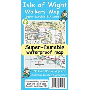 Isle of Wight Walkers' Map at 32k scale with challenge routes and walking trails highlighted.OS 50k scale mapping is expanded in size to produce a 32k map.The OS features, text and logos are now 50% larger making them much easier to read under outdoor conditions.Isle of Wight Challenge Route (66 miles) is specially highlighted in green and white so that the route stands out against the OS background map.Then we add the Earl Mountbatten Hospice's Walk (26.5 miles) highlighted in gold and white.A large range of gps surveyed walking trails are then highlighted in grey and white.The result is an easy to read `OSlike' map with walking trails specially highlighted.We then split the island into East (cover side) and West (reverse side) with a ten mile common overlap to the two sides; meaning you will only have to turn the map over if you are undertaking the longest Challenge or Earl Mountbatten routes.The result is a double sided 840mm by 694mm OSlike Super-Durable Map.We then print the map design on a 100 micron plastic substrate using a special UV curing inks process on the UK's only press capable of using this latest technology.The printed map sheets are then folded using a special concertina map fold to its pocket size of 230mm by 120mm.The result is the Isle of Wight Walkers' Map. A lightweight map that is both accurate and easy to read and use.Super-Durable means your map is waterproof and tearproof, and fully recyclable.This map will survive anything your Isle of Wight Challenges can throw at it and afterwards will fold up like new.Buying the Isle of Wight Walkers' Map also entitles you to receive the Custom Map digital edition of the map as a free download from Discovery Walking Guides.