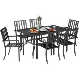 This Outsunny minimalist patio table and chairs set lets you host weekends, weeknights and more in style. Steel-framed chairs and a tall matching table are built to last through any activity. As a spacious six-seater set, it's suitable for summer entertaining - gathering friends and family together for many memories. When not in use, you can stack the chairs on top of each other to save space. Specifications: ● Colour: Black ● Material: Galvanised steel ● Table dimension: 150L x 90W x 73Hcm ● Chair dimension: 57W x 58D x 89Hcm ● Seat dimension: 48W x 43.5D x 42Hcm ● Armrest dimension: 4W x 49.5D x 62.5Hcm ● Backrest dimension: 49L x 48Wcm ● Stackable dimension(six chairs): 57W x 75D x 107Hcm ● Umbrella hole diameter: 42mm ● Weight capacity: 120kg(chair), 50kg(table) ● Certification: EN581 ● Item label: 84G-297V00BK ● Note: Suitable for an umbrella with a pole diameter of 40/38 mm, not included Just so you know: this item ships and arrives in separate boxes. Delivery times may vary