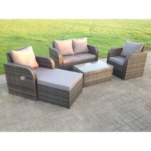 • This deluxe reclining rattan sofa set is a great addition to patio or garden, made of high quality PE rattan and durable galvanized steel construction for sturdiness and long lasting.Durability ,and can be put outdoor all year round. Perfect set to sit round with your family and friends. • Set Dimensions: • 1 x 3 Seater Sofa : 177W x 67D x 79H cm • 1 x Black Tempered Glass Table :140L x 80W x 70H cm • 2 x Reclining Chairs: 74L x 67W x 79H cm • 1 x Footstool: 65L x 65w x 34H cm • Dark grey mixed rattan with dark grey fabric .Color may some difference due to light or monitor .we are unable to return the item due to color problem . The 2 armchairs are adjustable, you can adjust the inclination of the chair back from 90°-130° through the button . • Items Comes Flat Packed And Easy Assemble,Sturdy Galvanized Steel Tube Metal Frames With Powder Coating To Prevent The Rust, Ergonomic High Back And Declining Design For Extra Comfort. • 8 CM Thick Seat Cushion And Without Back Cushion As Per