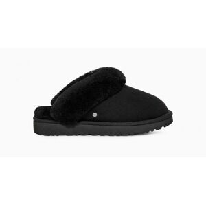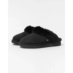 UGG Womens Classic Slipper II in Black Lined in signature shearling, this slipper-style Classic maintains the iconic feel of the original. Featuring a fluffy sheepskin collar, it's crafted from soft suede and finished with a Treadlite by UGG™ outsole for indoor-outdoor wearability. Suede upperSheepskin collar17mm sheepskin lining17mm sheepskin insoleTreadlite by UGG outsole for comfort or SugarSole™ EVA outsolePolyester binding or textile binding made from 100% recycled polyester fibresUGG® logo rivet, Woven label with UGG® logo on insole Item No. 1130876