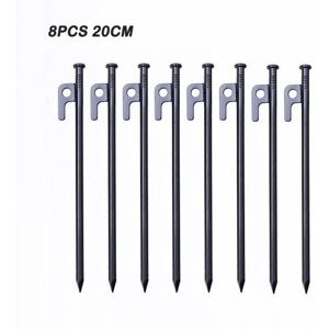 EASY TO USE The head of the tent peg is round in shape, which increases the force area when the hammer hits; The end is pointed and can be easily pierced when the ground becomes hard in winter and can be used in all seasons MULTIFUNCTIONThe ground nail is perfect for anchoring tents, garden nets and tarps, gazebos, castles, tents, trampolines, inflatables, camping, football nets USEWith a durable cloth bag, it is easy to carry. The metal cap and pointed tip make it easy to drive the stake into the ground and pull it out with the hole on the top. Strong enough to hold the tent against strong wind. MaterialMade of high-strength carbon steel, durable black coating, rust-proof, with strong load-bearing capacity, windproof, waterproof and cold-resistant. Practical design The holes and hooks allow the steel stakes to be quickly removed from the ground, and the holes can also be used to fix the rope