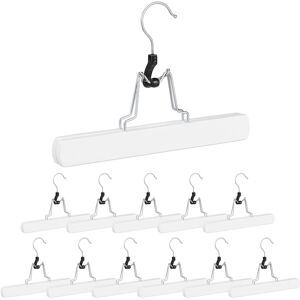 These sturdy pants holders combine a lovely look with functionality. The metal hooks ideally match the white wood. Whether you want to hang up skirts, shorts or pants: The felt lining allows no chance for wrinkles. The wooden hangers have a firm grip and are reliable closet helpers, while the 360° hooks provide a maximum of flexibility. You will receive a set of 12 compact pants holders. Trouser Clamp Holders Details - Size per hanger: H x W x D: approx. 17 x 25 x 2.3 cm - Metal hooks H x W: approx. 6 x 4.8 cm - Capacity: app. 1 kg per hanger - Weight per hanger: approx. 120 g - Material: Metal, plastic, wood & felt - Colour: White White Pants Hangers Set of 12 - Perfect for trousers, skirts, scarves etc. - Non-slip - With felt protectors - For even clamping - Counteracts wrinkling - Smooth painted wood surface Included in Delivery - 12 x Pants Hangers - Decorative items shown in product photos are not included
