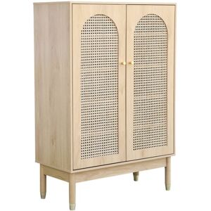 Product advantages: Robust Capacity: 20 pairs of shoes Caned facades Adjustable shelves If you are looking for a nice piece of furniture to store your shoes and transform your entryway into a chic and bohemian space, let yourself be tempted by the Judith cabinet. With a capacity of 20 pairs of shoes, you have enough space to store all your favorite pairs. Made from particle board, the Judith cabinet is sturdy and functional with its 4 shelves that you can position as you wish. No more puzzles, you can easily store your sneakers as well as your boots. You will find beautiful golden finishes on the handles and feet, and the two doors with caning bring bohemian style into your home. Ideal for the entryway, the Judith cabinet can also serve as a small buffet for organizing your dishes and will easily find its place in your kitchen or dining room. Dimensions and characteristics: Color: natural Capacity: 20 shoes (4 per shelf) The shelf level is adjustable, allowing for the storage of