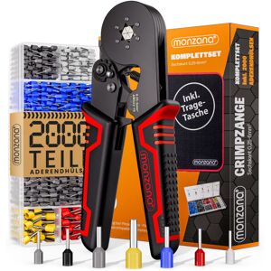 Precise connections made easy! The hex crimping pliers from MONZANA are robustly made of high-quality steel and reliably crimp wire end sleeves. The pliers have a crimping width of 0.25-6mm² , making them also suitable for small ferrules and can be used for a wide range of electrical work. The ergonomically shaped handle made of rubberised material ensures a good and secure grip, while the comfortable grip width allows you to work relaxed and with little effort. The pressing unit automatically adjusts to the respective sleeve size and enables even pressure on the sleeves. If necessary, the pliers can be readjusted using a wheel. The crimping pliers can be locked and unlocked with a small lever and stored in a practical bag made of robust Oxford material when the work is done. The transparent plastic assortment box contains 2,000 wire end sleeves , sorted by colour and size. The colour code of the enclosed sleeves is adapted to DIN standard 46228 and is therefore particularly clear.