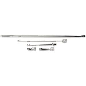 Expert Quality, manufactured from chrome vanadium steel hardened and tempered, with a polished finish. Each ext. bar has a knurled ring for extra grip. Attached with a spring - loaded ball bearing for secure socket holding. Manufactured and tested generally in accordance with DIN3122 and ISO3315 Specifications Features and Benefits • Expert Quality • Contents: 45, 75, 150, 250 and 450mm • Allows sockets to be driven at up to 15° off vertical • Chrome vanadium steel hardened, tempered, chrome plated and polished • Spring-loaded ball bearing for secure socket holding Contents 5 x Extension bars: 45, 75, 150, 250, 450mm