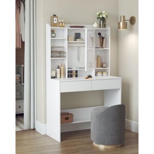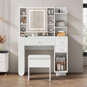 Let this dressing table become the elegant centerpiece of your bedroom or dressing area, blending functional design with artistic flair to redefine your makeup routine. The smart-lit mirror features three colour temperatures (warm/natural/cold light) – simply long-press the touch panel to adjust brightness, delivering professional-grade illumination for flawless makeup application from morning quick routines to evening skincare rituals. The spacious top combines three open shelves, two drawers, and a storage cabinet for organized placement of cosmetics, jewelry, and skincare products, while the expandable and foldable countertop adapts to diverse needs. Whether preparing for workday looks or glamorous night-out styles, the streamlined frame paired with the HD LED mirror ensures salon-worthy precision, turning every makeup session into a luxurious experience. Ivy Bronx