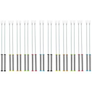 FAMILY PACK: 24 pieces fondue forks in random colors are absolutely easy to use. Lightweight stainless steel handles and small enough to fit in the palm of your hand, take your dinner parties, picnics or camping get-togethers to a whole new level. Sharing high-quality chocolate fondue at a party has never been easier. The fondue forks experience in fondue dippers makes food taste amazing. Perfect for chocolate fondue party, cheese fondue, roasting marshmallows, for a picnic and camping. SIZE: 9 1/2 inch fondue forks going a long way without getting burned while cooking, with a nice long body for perfect dipping and scooping up every last drop of chocolate and cheese. PREMIUM MATERIALS: Our forks are made of stainless steel. The tip of the forks used an inner arc designed, which is better for fixing food. With a polished stainless steel finish, giving you a smoother experience. HEAT INSULATION ON THE HANDLE: Heat insulation prevents you from getting burned when the handle gets hot, as