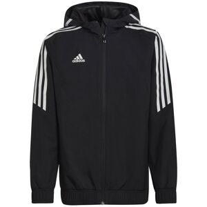 The weather is just another opponent to be bested.This juniors adidas football jacket lets you train through light showers and drizzle.Its bungee-adjustable hood and elastic cuffs help keep out the elements.Zip pockets ensure your possessions stay dry.Made with 100% recycled materials, this product represents just one of our solutions to help end plastic waste.FEATURES:-MADE IN PART W RECYCLED MATERIALS.-Regular fit.-Full zip with bungee-adjustable lined hood.-100% recycled polyester plain weave.-Mesh lining.-Front zip pockets.-Elastic cuffs and hem.