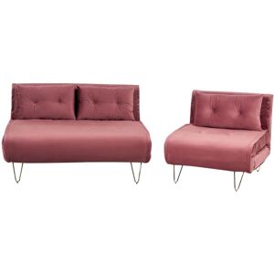 2 Piece Velvet Sofa Bed Set. Bring a glamorous feel to your interior with this functional and alluring sofa bed set. The upholstery made of durable velvet is exceptionally soft to the touch, and the thick padding makes it truly comfortable. The upscale look of the furniture is emphasized with the gold metal legs. The additional cushions with button tufting and removable covers add a bit of charm and cosiness to the couches. Moreover, thanks to the easy to operate sleeper function, you do not need to worry whenever your guests want to sleep over at your place. Details: Product Type: 3 Seater Sofa Style: Glam General Color: Pink, Gold Material Type: Fabric Main Material: Velvet Additional Material: Iron Filling Material: Foam Material Composition: 100% Polyester Arm Style: Armless Seat Construction: Sinuous Springs Seat Foam Density: 50 kg/m3 Seats Up To: 3 People Sleeper Function: Yes Sofa Bed Open Mechanism: Fold-Out Dimensions: 2 Seater Sofa Dimensions: 130x78x81 Seat Thickness: 30