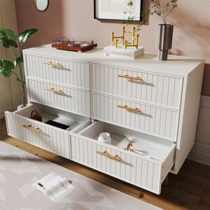 This retro-inspired chest of six drawers adds a stylish touch to any bedroom or living space. Featuring elegantly fluted fronts, it beautifully combines vintage charm with modern functionality. The sleek gold metal handles and legs enhance its sophisticated appeal while providing sturdy support. Each drawer offers ample storage for clothing, accessories, or personal items, making organisation effortless. With its unique design and attention to detail, this chest is a stunning statement piece that effortlessly complements a variety of interior styles. Fairmont Park Colour: White