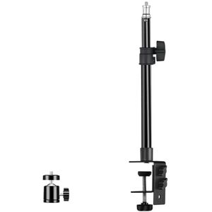 [Adjustablement] Adjustable Desktop C-clamp Stand: The height could be extended from 35.5 to 51.2 cm. The ball head can 360 degree horizontal rotating and from 90 degree to 90 degree tilting for panoramic photography when adjusting the angle. You can use the knob to adjust to the desired angle to meet your needs at different angles. Made of highly- aluminum-alloy material with stainless steel, using a more stable structure. [Flexible Position] With its solid-metal clamps, adjustable and sturdy stand. Mounts to the back of your deskvia a heavy-duty C-clamp or optional grommet mount. Our desk mount stand can be adjusted to any thickness within seconds as needed Colour:Black Material:aluminum alloy Package Contents: 1 * Tripod 1 * Ball Head Only the above package content, other products are not included. Note: Light reflection and different displays may cause the color of the item in the picture a little different from the real thing. The measurement allowed error is +/- 1-3cm.