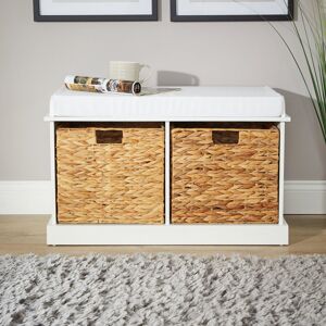 With this storage bench you get the solution for two problems at once. The 2 baskets create storage space for shoes, scarves and more. And at the same time, you get a comfortably padded ottoman for your hallway, kitchen or bedroom. The clean design of the bench fits any interior style and brightens the room with its light colours. The assembly is very easy when following the included instructions. Ottoman Bench Details - Total size H x W x D: app. 44 x 72 x 35 cm - Basket outer size H x W x D: app. 30 x 32 x 31.5 cm - Basket inner size H x W x D: app. 29 x 29 x 29 cm - Cushion size H x W x D: approx. 4.5 x 65 x 33 cm - Capacity: app. 100 kg bench, app. 8 kg per basket - Weight:app. 14.6 kg - Material: MDF, foam, polyester - Colour: White Handy Storage Bench Scandinavian Style - Added storage space for shoes, scarves & more - Ideal for kitchen, hallway and bedroom - Soft padding for a pleasant sitting experience - Subtle white design with light grey cushion - Hooks prevent baskets from