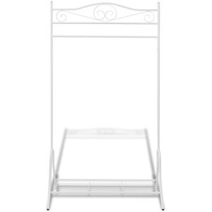 This sturdy clothing rack presents a quick and convenient clothing storage solution. It can be placed anywhere in your home and is ideal for keeping your clothing organised and crease free. This clothing rack, with top hanging bar and bottom shelf, will create extra hanging space for your suits, dresses, shoes, and more. It offers you easy access to all of your clothes and accessories. The elegant ornate details make this coat stand decorative as well as practical. This garment rack has a sturdy steel structure, which makes it lightweight yet strong. The bottom shelf can be used to store shoes or baskets. Assembly is really easy. August Grove Colour: White