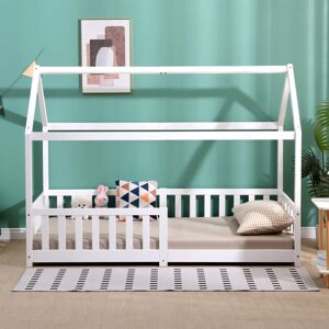 Product dimension:W196cm × D98cm × H178.5cm Suggested mattress size(not included):90cm × 190cm Enchanting Playhouse Design with Decorative Chimney:Transform your child's room into a magical haven! This adorable white kids bed features a charming rooftop with a cute decorative chimney, sparking imaginative play. The classic playhouse design creates a cozy and whimsical sleeping space that your little one will love, making bedtime something they look forward to. Secure & Breathable 4-Sided Slatted Grille Panels:Ensure safety and peace of mind with full-length slatted grille panels on all four sides. This design provides excellent ventilation and allows your child to see out easily, preventing any closed-in feeling while securely ensuring they stay safe throughout the night. The sturdy construction offers robust protection for a worry-free rest. Spacious Interior:Designed for convenience, this bed frame perfectly accommodates a standard single mattress (90x190cm), which is sold
