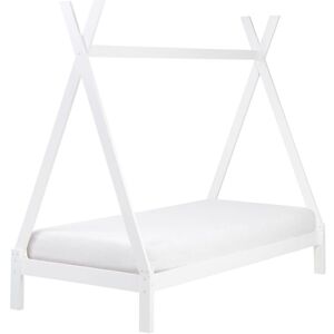 Kids Tipi-Shaped Bed Frame. This bed is thoughtfully designed with toddlers in mind, making it a perfect addition to any child's room. Its exceptionally low profile ensures easy access for little ones, while its short distance from the floor provides a reassuring sense of security. Crafted from sturdy pine wood, the frame offers both durability and stability, ensuring a high-quality piece that will stand the test of time. Details: Product Type: Kids Bed Style: Modern General Color: Brown Material Type: Wood Main Material: Pine Wood Fabric Upholstered Back: Yes Finish: Lacquered Dimensions: Width: 99 cm Length: 208 cm Height: 176 cm Sleeping Surface: 90x200 cm Weight: 20 kg Weight Capacity: 120 kg Offer Includes: 1 x Bed Frame, 1 x Slatted Frame (15 Rolled Slats), Not Included: Mattress, Bedding and Cushions Key Features: Great Addition to a Nursery or Child's Bedroom, Creates a Cosy Atmosphere, Minimalistic, Scandinavian Style, EN 71-3 Compliant, the Product is Free From Harmful