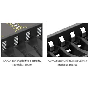1. Charger can charge 1-8 AA/AAA Ni-/Ni-Cd rechargeable batteries, LCD displays. 2. Charging under IC control. Intelligently cut off the charging mode, then switch to trickle charge, ensure it is fully charged, meanwhile, protect it from overcharging. Model Number: LCD-006 Input: 100-240V DC, 50/60Hz Output: 1.2V, DC 2000mA AA: 2000mA x 1/1000mA x 2/660mA x 3/500mA x 4/400mA x 5/330mA x 6/285mA x 7/250mA x 8 AAA: 1000mA x 1/ 500mA x 2/ 330mA x 3/ 250mA x 4 / 200mA x 5/165mA x 6/140mA x 7/125mA x 8 Plug: MICRO-type,TYPE C Advantages: (1) High-end material (2) High quality (3) Advanced technology and fine workmanship (4) Safety color: black Material: plastic Size: 122x92x33mm Package Contents: 4 x LCD006 Battery Charger (without battery) 4 x Cable Only the above package content, other products are not included. Note: Light reflection and different displays may cause the color of the item in a little different from the real thing. The measurement allowed error is +/- 1-3 cm.