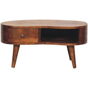 This mini solid wood coffee table has been constructed from 100% solid mango wood in a chestnut finish and offers a uniquely shaped design with rounded edges. It features one open slot and one drawer with a shiny knob and nordic-style legs. A great simple and add to the bedroom. This product is part of the Recession collection. Union Rustic Colour: Oakish