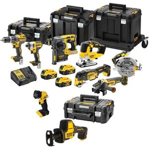 This Dewalt 9 Piece DeWALT XR Brushles lithium kit includes a DCD796N Brushless Combi Drill, DCF887N Brushless Impact Driver, DCS355N Brushless Multitool, DCG405N Brushless Angle Grinder, DCS570N Brushless Circular Saw, DCH273N Brushless SDS Hammer Drill, DCS334N Brushless Jigsaw, DCS369N Brushless Reciprocating Saw and Torch with 3 x 5.0Ah DCB184 slide fit lithium batteries, DCB115 multi voltage charger and 3 Tstak Cases with Carrier Trolley DCD796 Combi Drill : Two speed all metal transmission for increased runtime and longer tool life Drill Driver and Hammer feature for multiple applications 15 position adjustable torque control for consistent screw driving into a variety of materials Intelligent trigger design allows for total control of application Steel belt hook and magnetic bit holder ensures strong storage solutions DCF887 Impact Driver: High power Brushless motor outputting up to 205Nm of torque ensures heavy applications are completed quickly PrecisionDrive mode offers